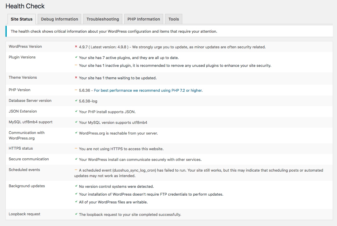 以上就是WordPress站点发生突出时的检查步骤,更多关于Health Check的信息,请访问https://make.wordpress.org/support/handbook/appendix/troubleshooting-using-the-health-check/
