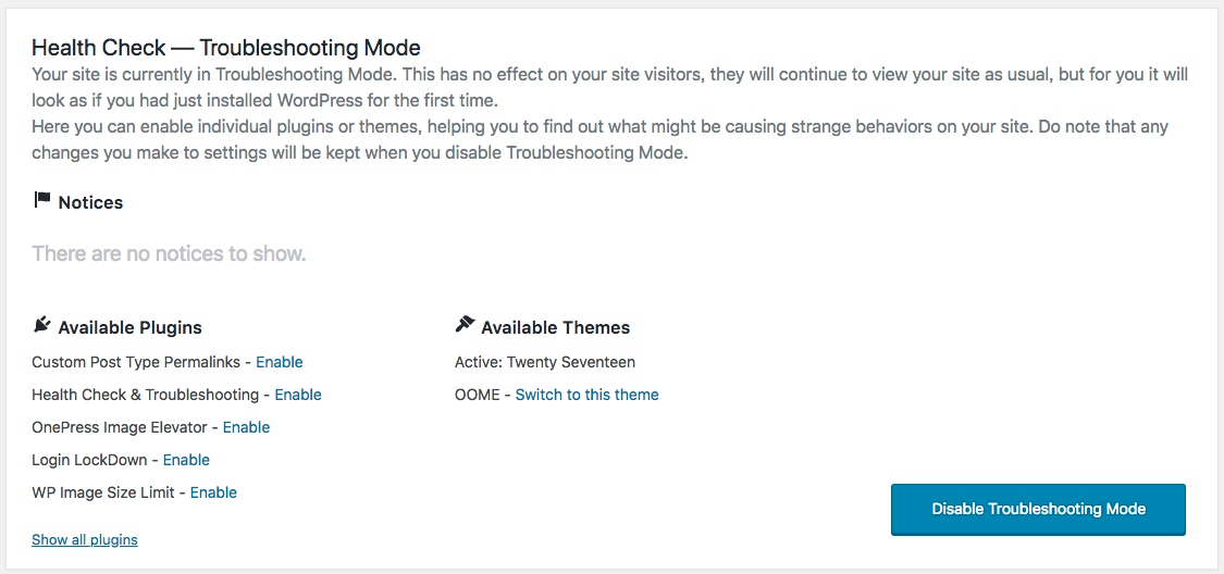 A、Yes,问题重新出现了,表明这个问题不是由插件引起的,你可以在【仪表盘】→【首页】页面的“Health Check — Troubleshooting Mode”模块位置,点击“Disable Troubleshooting Mode”按钮禁用。