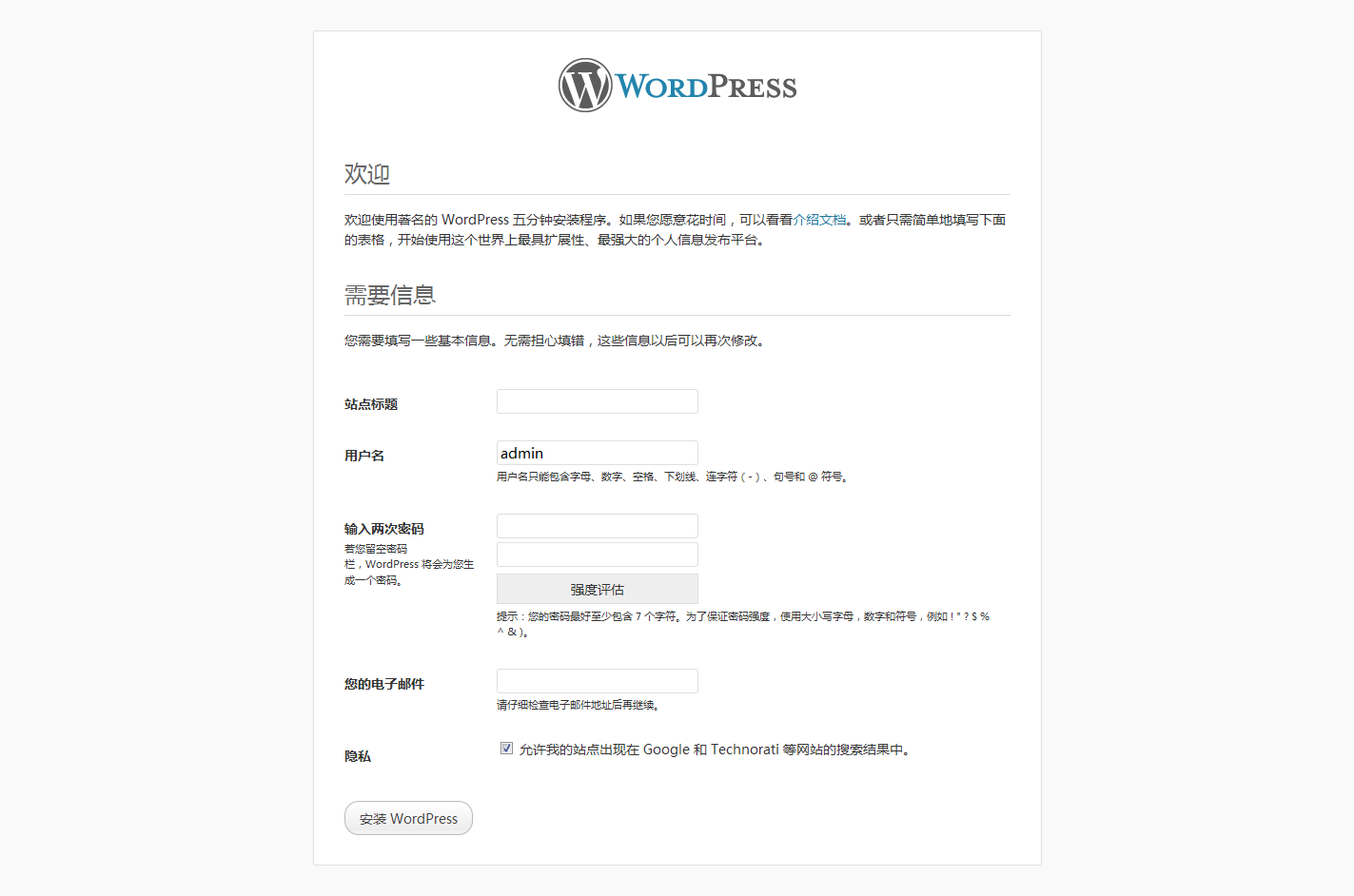 通过以上三步就轻易完成了WordPress的安装,是不是很简单啊。接下来,你只需要在如下图所示的界面中维护站点信息和管理员用户名、密码、邮箱,之后即可享受WordPress带给你的乐趣。