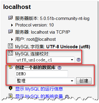 在如上图所示的界面中,“MySQL链接校对”选择utf8_unicode_ci,“创建一个新的数据库”后面输入你要创建的数据库名称,然后点击“创建”按钮,即完成了MySQL数据库的创建。