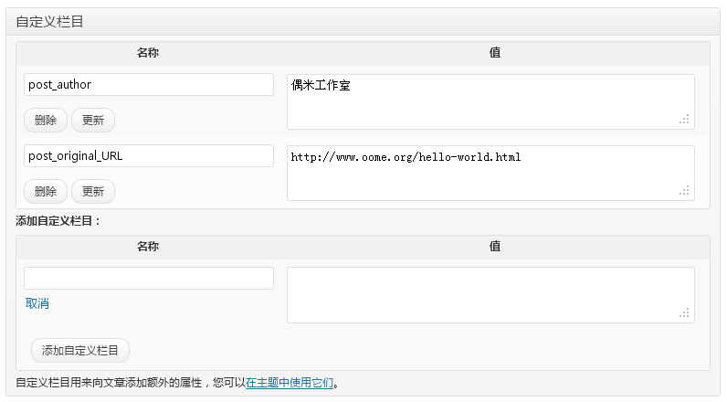 自定义字段是除WordPress插件外的另一强大扩展接口,现在不少主题都已经集成自定义域,比如摘抄文章时使用自定义字段指定原文作者和链接,这样子就可以在文章按照设定好的样式显示文章作者和来源,为用户提供友好体验。