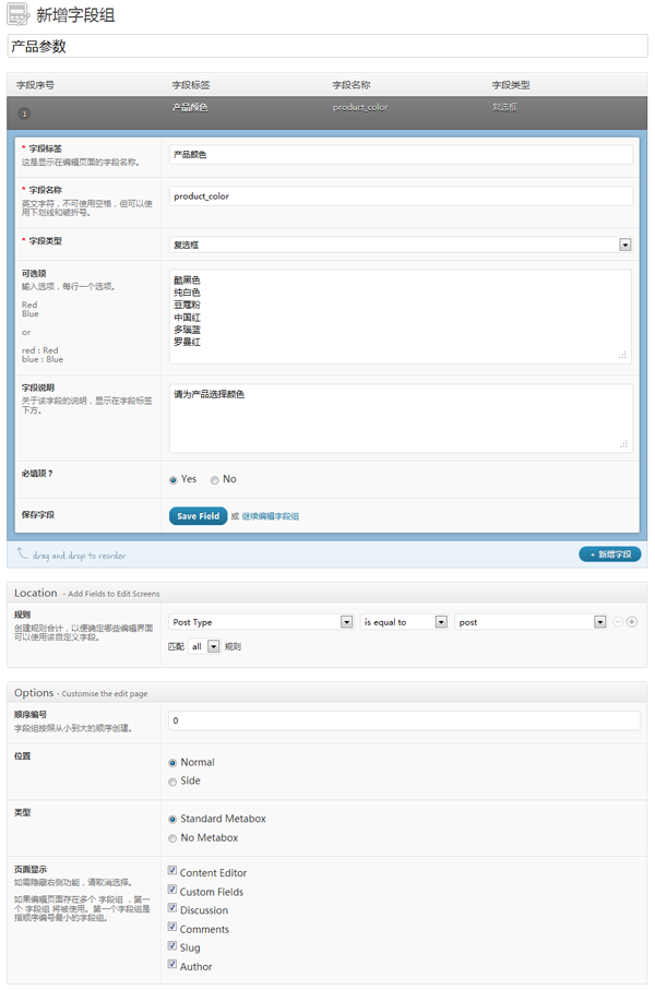 Advanced Custom Fields 插件为你提供创建自定义编辑界面功能,适用于任何WordPress站点开发者或者爱好者,且提供强大的API接口。插件支持的自定义域类型包括:可视化编辑器、文本字段、文本域、图像、文件、单选按钮、复选框、页面链接、文章选择、日期选择器、颜色选择器 等等。