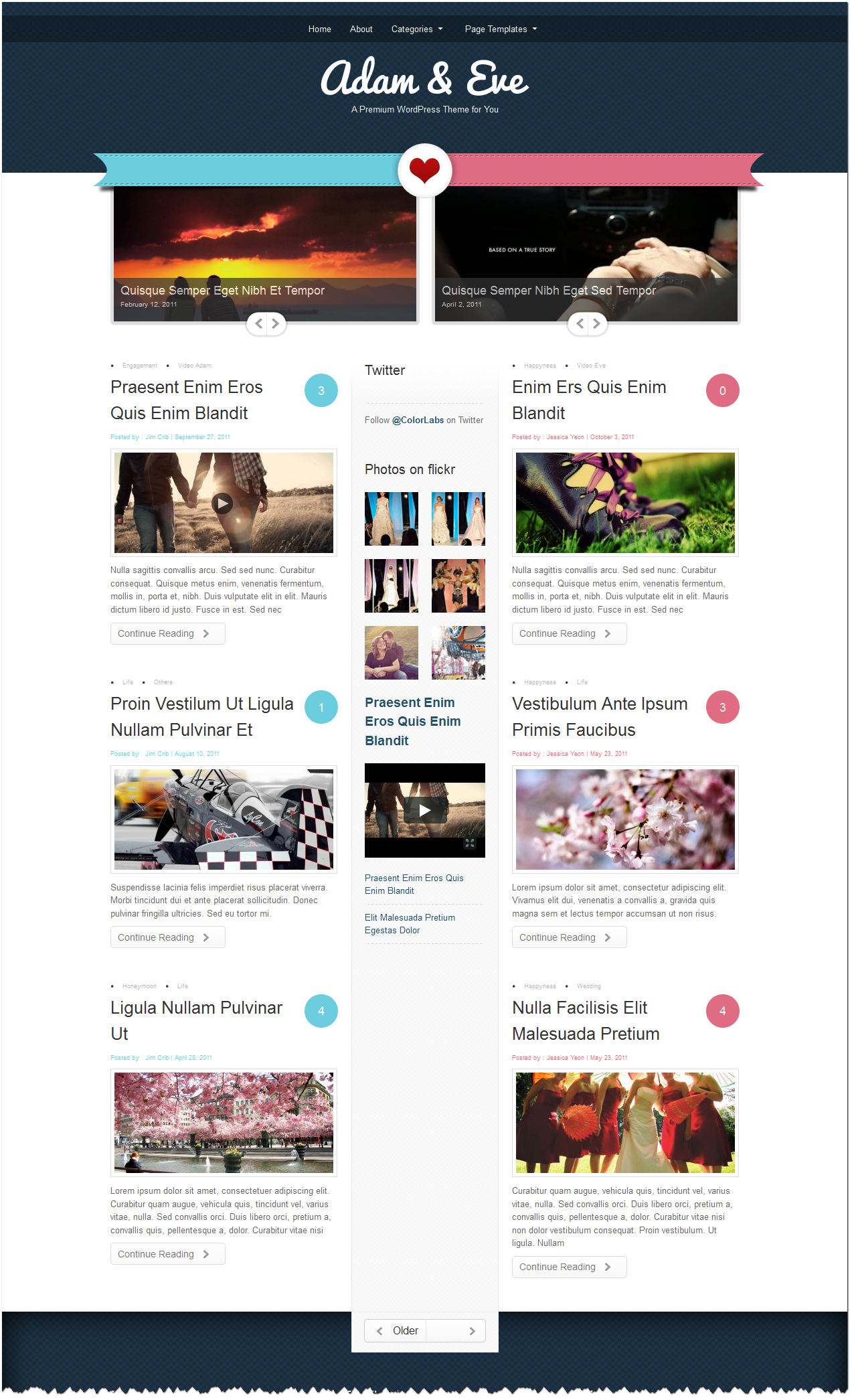 Adam - Eve主题是一款专门为情侣或者夫妻设计的主题,对栏格式,方便双方撰写自己的博客,同时该主题具有独立的幻灯片和侧边栏,方便管理各自的特色博文和侧边栏。