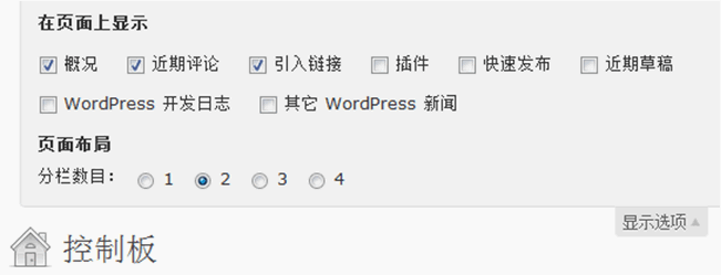 因为不同的用户有不同的喜好,这种情况下,我们不需要通过代码彻底删除模块,只需要将不需要的模块隐藏即可,其实方法很简单,在控制板页面右上角有个“显示选项”按钮,点击可以弹出如下图所示的选项,你可以根据需要去除不需要的模块,当然也可以根据需要设定页面分栏数目。